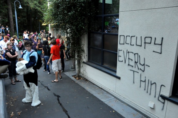 Some of the more radical and militant forces within this movement have adopted the slogan ‘Occupy Everything, Demand Nothing’. For these tendencies, the act of issuing demands immediately empowers decision makers such as administrators and politicians and orients the movement in the direction of the halls of power. The movement becomes reduced down to the radical wing of a lobbying effort whose fate is in the hands of those in the state who have the power to meet the demands or send in the riot police to crush the resistance. The first occupations chose to issue no demands to power. They turned their backs on the administration and the state and instead oriented themselves to the students and young people anxious about their future and looking for an outlet for their rage. ‘Occupy Everything’ was the cry that emerged from these occupations. It was a call to the people to take action and seize what belongs to everybody. Instead of asking power to improve conditions in education and the overall society, ‘Occupy Everything, Demand Nothing’ prescribes the immediate communization of space and confrontation with capital as the only means forward even if the autonomous and communized zones that emerge are only temporary at this point in the struggle.