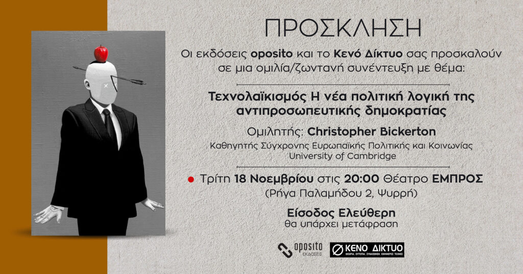 ΤΡ. 18/11/2025 Οι εκδόσεις oposito και το Κενό Δίκτυο παρουσιάζουν ομιλία του καθηγητή Christopher Bickerton για το βιβλίο του: “Τεχνολαϊκισμός: Η νέα πολιτική λογική της αντιπροσωπευτικής δημοκρατίας”