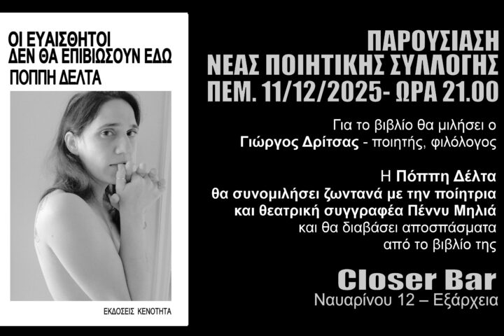 Οι Εκδόσεις Κενότητα ανακοινώνουν την κυκλοφορία της νέας ποιητικής συλλογής της Πόππης Δέλτα με τίτλο «ΟΙ ΕΥΑΙΣΘΗΤΟΙ ΔΕΝ ΘΑ ΕΠΙΒΙΩΣΟΥΝ ΕΔΩ». Η παρουσίαση του βιβλίου θα γίνει Πέμ. 11/12/25 στο CLOSER bar – Εξάρχεια