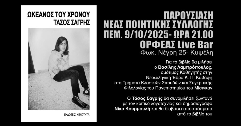 Οι Εκδόσεις Κενότητα παρουσιάζουν την νέα ποιητική συλλογή του Τάσου Σαγρή με τίτλο «Ωκεανός του Χρόνου», μια χαρτογράφηση της σύγχρονης μητροπολιτικής εμπειρίας.